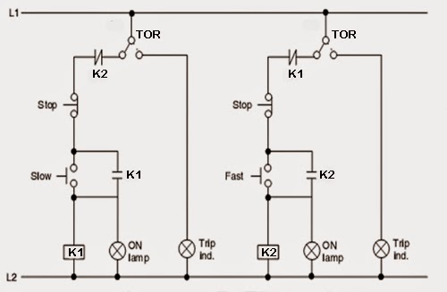 Seperti yang ditunjukan pada gambar 3 di atas, dua buah kontaktor disertakan untuk kecepatan rendah dan tinggi. Kedua kontaktor tersebut secara kelistrikan tidak boleh bekerja bersamaan. Untuk memproteksinya dipisahkan oleh masing-masing proteksi beban lebih dan diamankan dengan menyilangkan kontak NC masing-masing kontaktor.