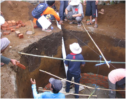 9. Isi celah/rongga antara dinding digester dan manhole dengan dinding galian. Kemudian padatkan secara perlahan-lahan dan tidak menekan dinding bata yang masih belum kuat benar.